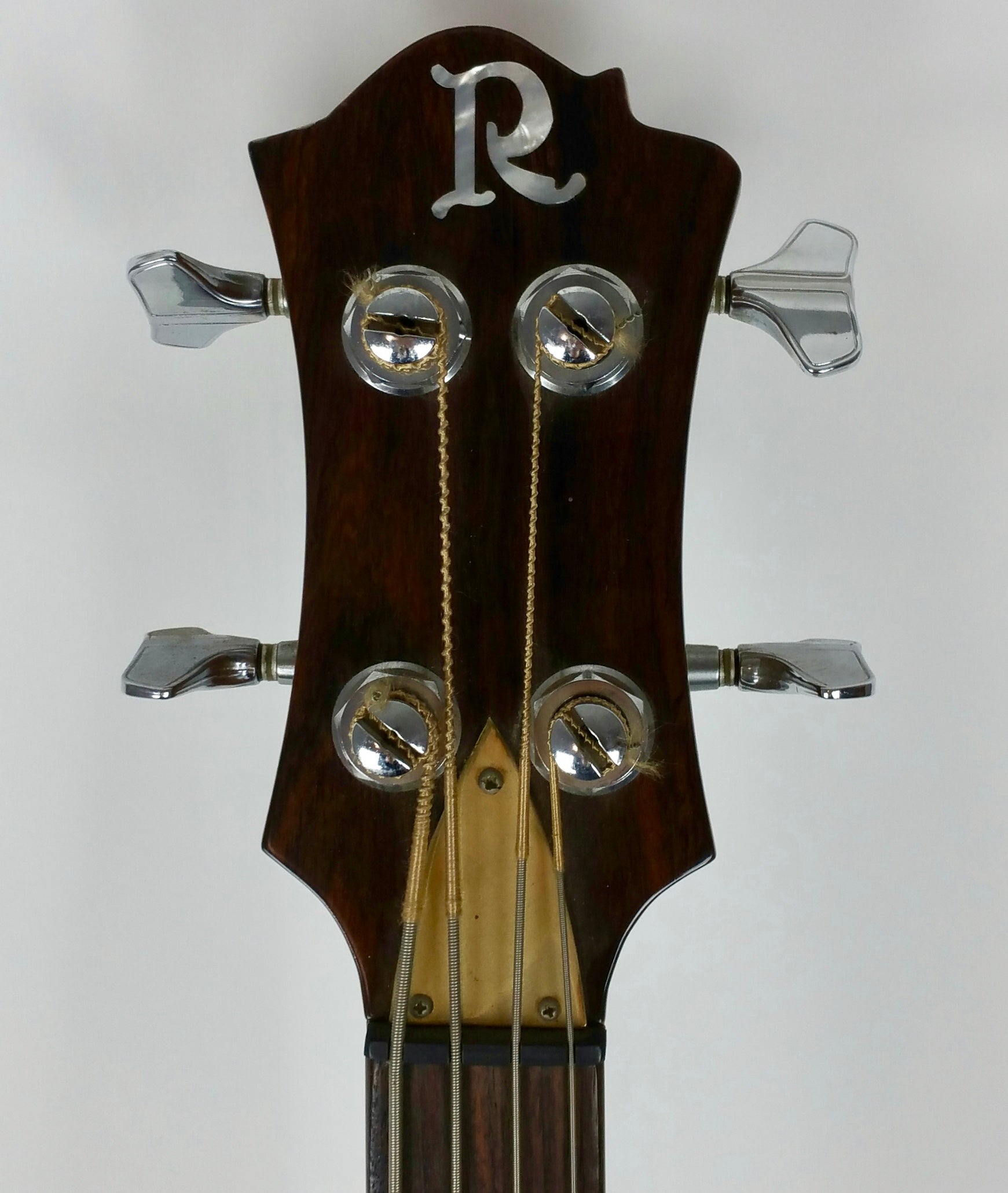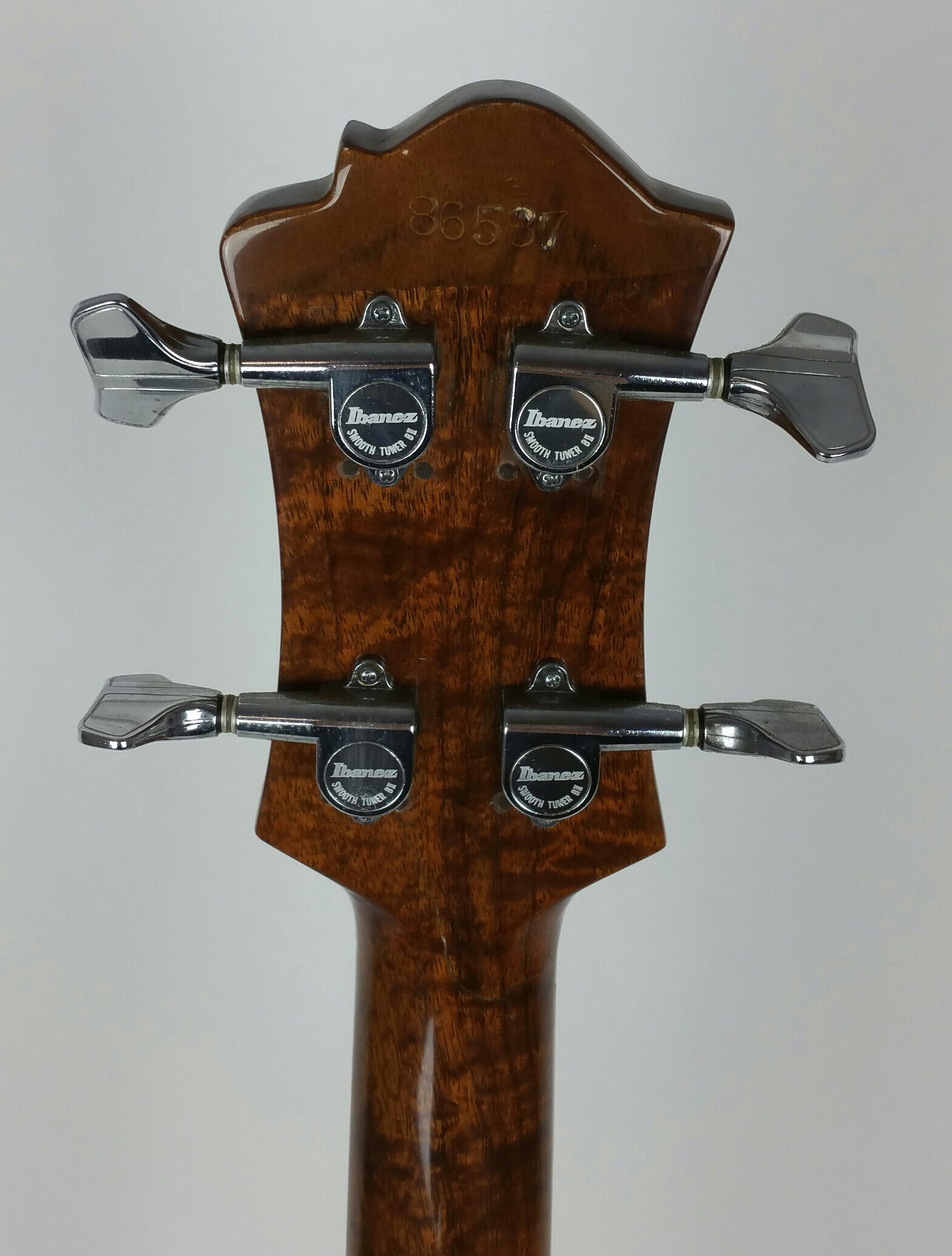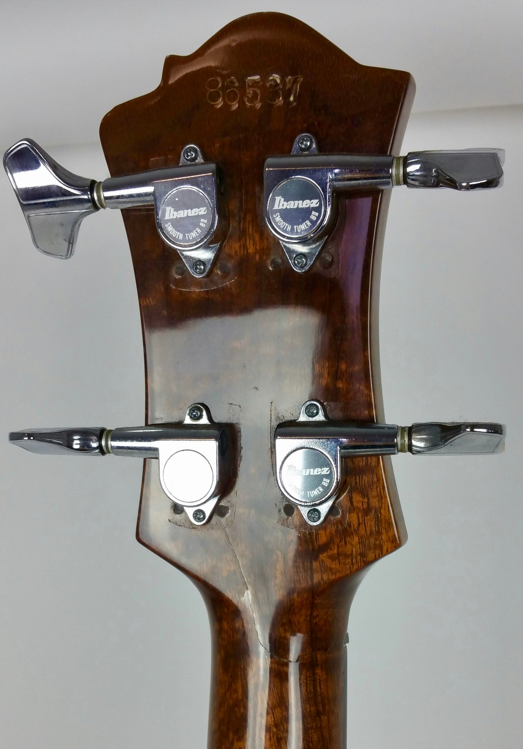 1980 BC Rich Mockingbird bass, koa with maple stringers. We bought this bass in the mid-1990's. We bought it as it is, with the headstock repair and the Ibanez tuners.