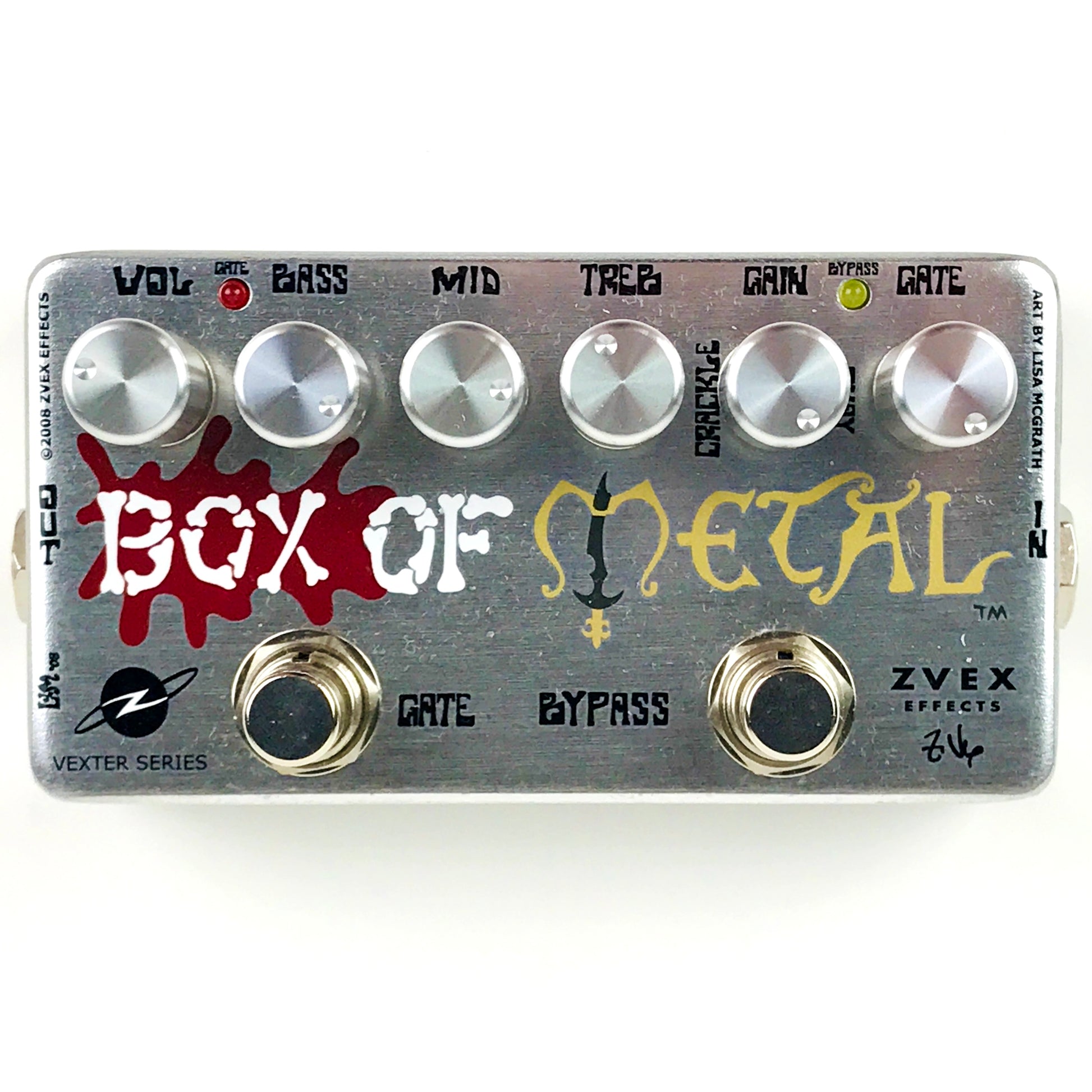 The Box of Metal (tm) is an aggressive high-gain pedal with a highly-effective built-in switchable gate which dramatically reduces noise and unwanted feedback. It is available in Vexter (2-year warranty) and hand-painted (lifetime warranty-my lifetime) versions. Its gain and tonal characteristics are somewhat similar to high-gain tube amplifiers that have been the staple of hard rock and metal sounds since the 80's. On the right, there is a true- bypass switch with an indicator LED to bypass the entire effect. On the left is a gate switch which is only effective when the pedal is on (the gate cannot be used separately.) When the gate's LED (on the left side of the pedal) is ON, the gate will be active whenever the pedal is turned on. The gate is very useful for cleaning up any noise between palm-muted chords and lead phrases, but may be switched off to initiate feedback or to stretch out soloed notes that are fading into noise. Switching off and on the gate is silent so the gating action of the pedal can instantly be changed during any part of the performance to fluidly integrate soloing and palm-muted chords.
