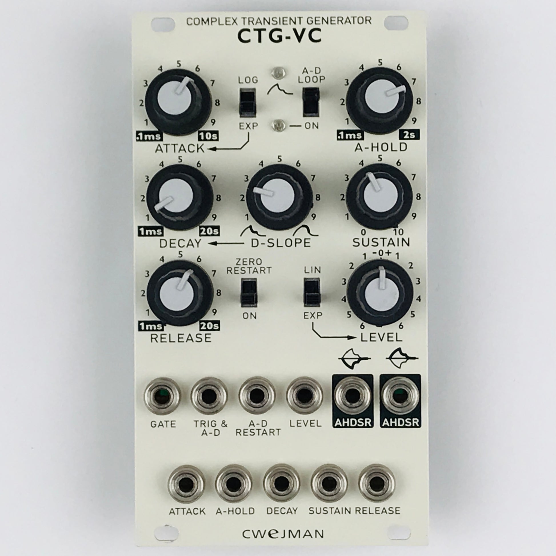 The CTG-VC is a complex transient generator with a lot of features, such as; different shapes for the attack, attack hold (A-HOLD) for a more punchy sound than with a standard attack, variable decay slope (D-SLOPE) from natural exponential to heavy logarithmic, attack-decay loop (A-D LOOP) and polarized level for outgoing transient signals which means that both outputs levels are controllable in both directions (positive and negative).