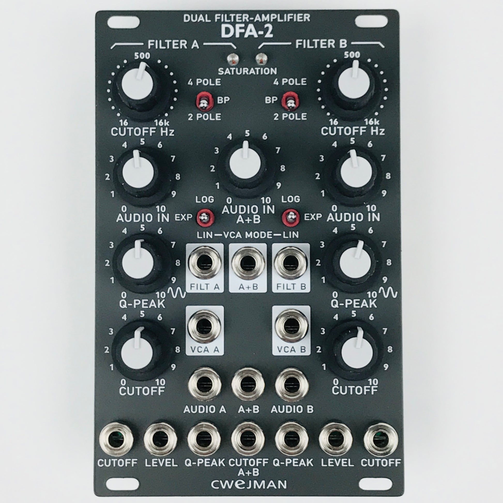 Both filters (A and B) are identical and can be controlled separately and by master inputs for the cutoff (CM A+B). The audio outputs from both filters are combined (LPF A+B and BPF A+B) with dual resonance (peak and offers "formant" shaped sounds in low pass and band pass mode. Filters has an individual audio inputs and additionally combined input (AUDIO A+B).