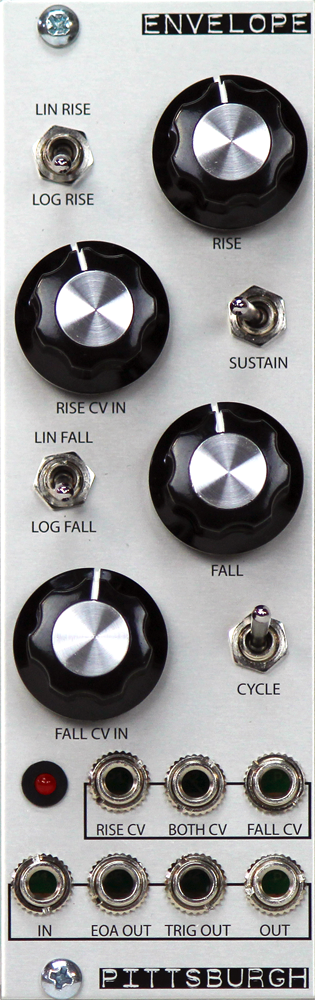 The Pittsburgh Modular Envelope is a complex multi-stage envelope generator with voltage controllable rise and fall. Using the sustain switch to toggle between modes, the Envelope functions as either a 2 stage attack-decay envelope or a 3 stage attack-sustain-release envelope.