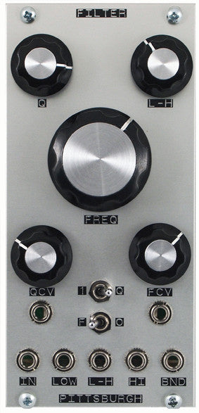 Mode switches between Filter and Oscillator modes. Set to "Filter", the Pittsburgh Modular Filter will not self oscillate. Set to "Oscillator" the Filter produces a high quality voltage controlled sine wave. Adjusting the Q while in Oscillator mode modifies the shape of the waveform. At more extreme settings the Q adds anything from warm fuzz to heavy distortion the incoming audio.