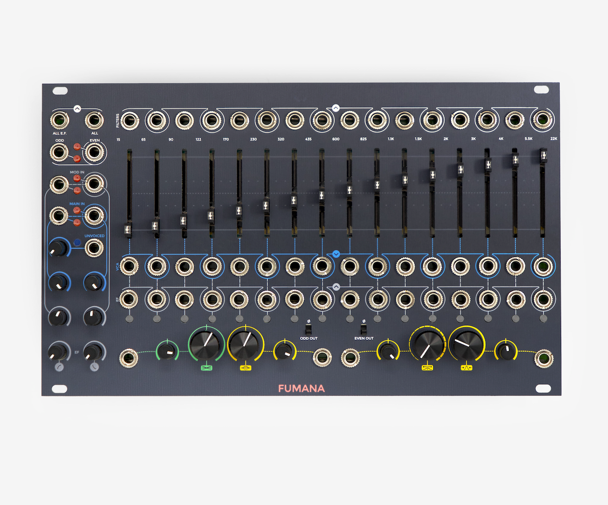 The FUMANA is an all-analog dual filter bank with various control to access dynamically these bands. Each filter bank is composed of an array of 16 independent 48dB/oct bandpass filters. Having two identical filter arrays, allows you to use one of those for spectral analysis (of a modulator signal) and the other for spectral re-synthesis (of the main signal). Each array is sub-grouped in odd and even bands (numbering these increasingly from 1 to 16 from left to right). It is possible to apply different signals to odd and even bands, both for main and/or modulator arrays. This, together with the 16 envelope followers connected to each band of the modulator filterbank, and the 16 VCA connected to each band of the main filterbank, allows the FUMANA to perform a single 16 bands or a dual 8 bands analog spectral transfer.