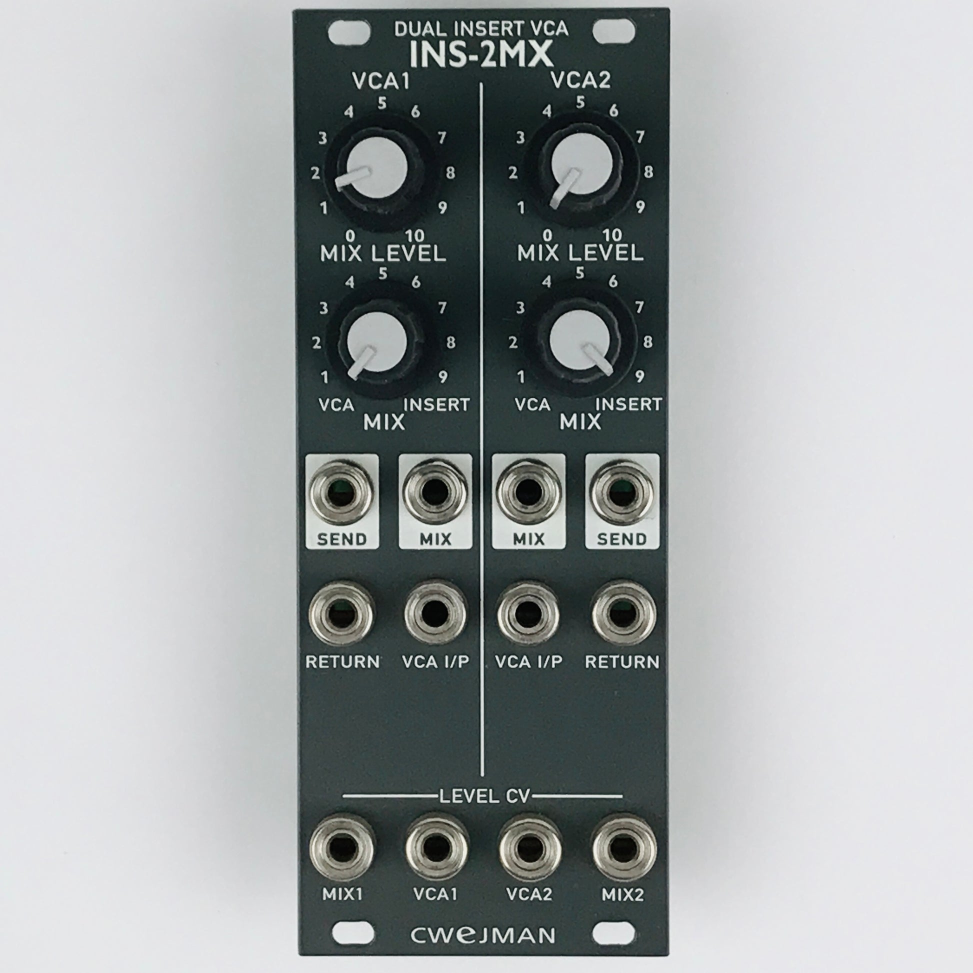 The INS-2MX consist of two VC amplifiers, two insert VC amplifiers and controllers. All parameters can be controlled manually (with knobs) or by external signals. The main VCA works in a semi-logarithmic mode. The semi-logarithmic transfer function is much more practical than a true logarithmic because it's "imitates" the natural behaviour of volume controllers All VC amplifiers accept both DC and AC signals. The INS-2MX has two outputs (a single channel); a mixed signal output and SEND output for an external effect device(s). The MIX controller combines incoming (dry) signal with processed signal from an external effect device.