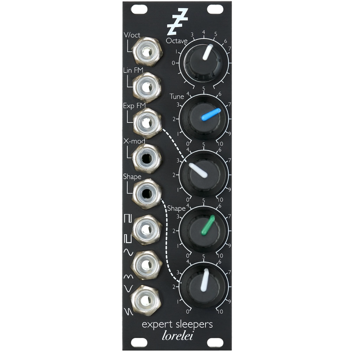 Lorelei' is a VCO (Voltage Controlled Oscillator) with quadrature sine outputs, waveshaping, and sync/cross-modulation options.