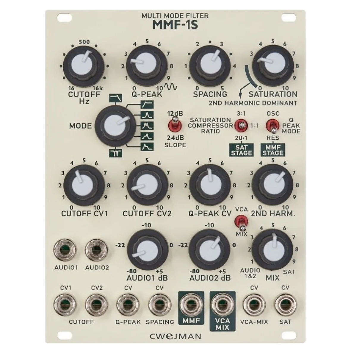 The MMF-1S is the successor to the MMF-1 Multi-Mode Filter. The MMF-1S features an onboard VCA, saturation section with 2nd harmonics and 7 filter modes including dual peaked modes with a spacing control.