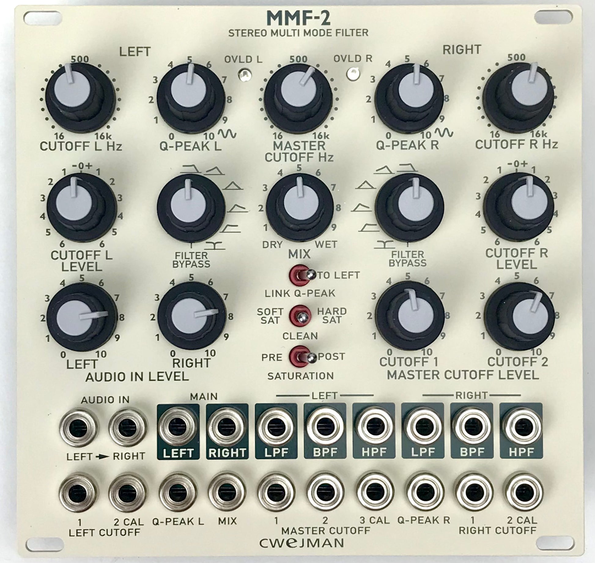 The heart of the MMF-2 is two four pole multi mode filters with six selectable outputs for the main stereo outputs; low pass, low-band pass, band pass, band-high pass, high pass and notch + bypass. Three outputs/filter are available too; low pass, band pass and high pass and which are not affected by the saturation in the post mode. The corner frequency (CUTOFF L and CUTOFF R) is individual for both filters and the MASTER CUTOFF controls both. The Q-PEAK determines the resonance up to self oscillation point and is controlled individually or by the LEFT Q-PEAK when activated by the switch LINK TO LEFT. Both CUTOFF and Q-PEAK can be controlled manually and by inserted signal(s) in to the CV inputs. Those CV signals can control left and right filter and/or both when control signals are inserted in to the MASTER CV inputs.