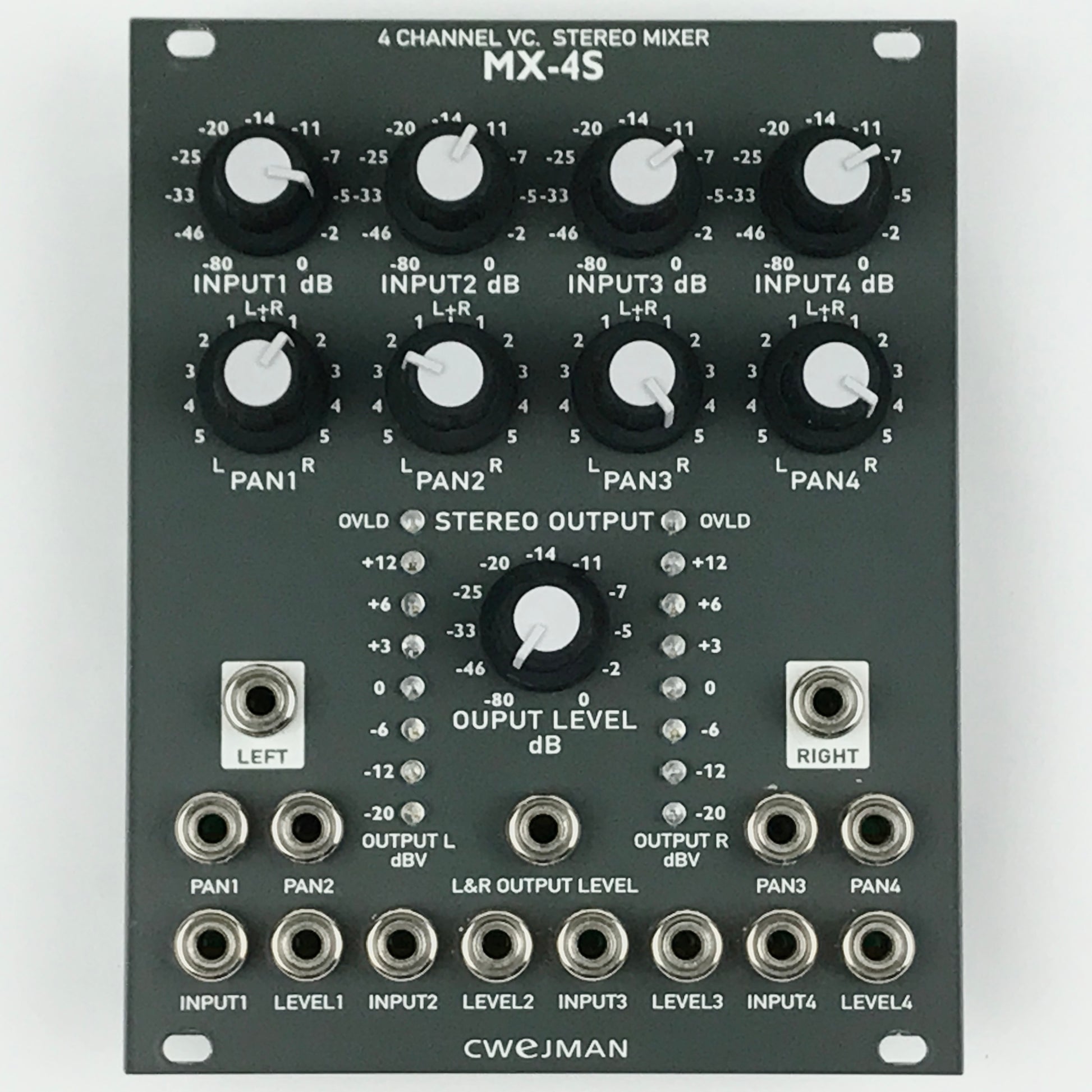 The MX-4S is a voltage controlled stereo mixer with four independent inputs. All parameters such as input gain, panning and output gain (both left and right channels output level are ganged) are controlled manually by knobs or associated CV inputs.