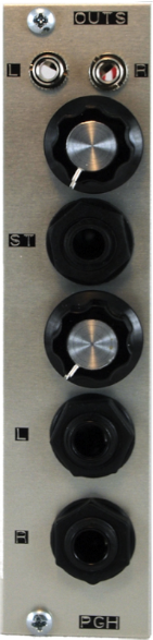 The simplest way to get sound out of a modular. Outs is a dual output module featuring a stereo 1/4" headphone amplifier output and dual mono 1/4" line level outputs.