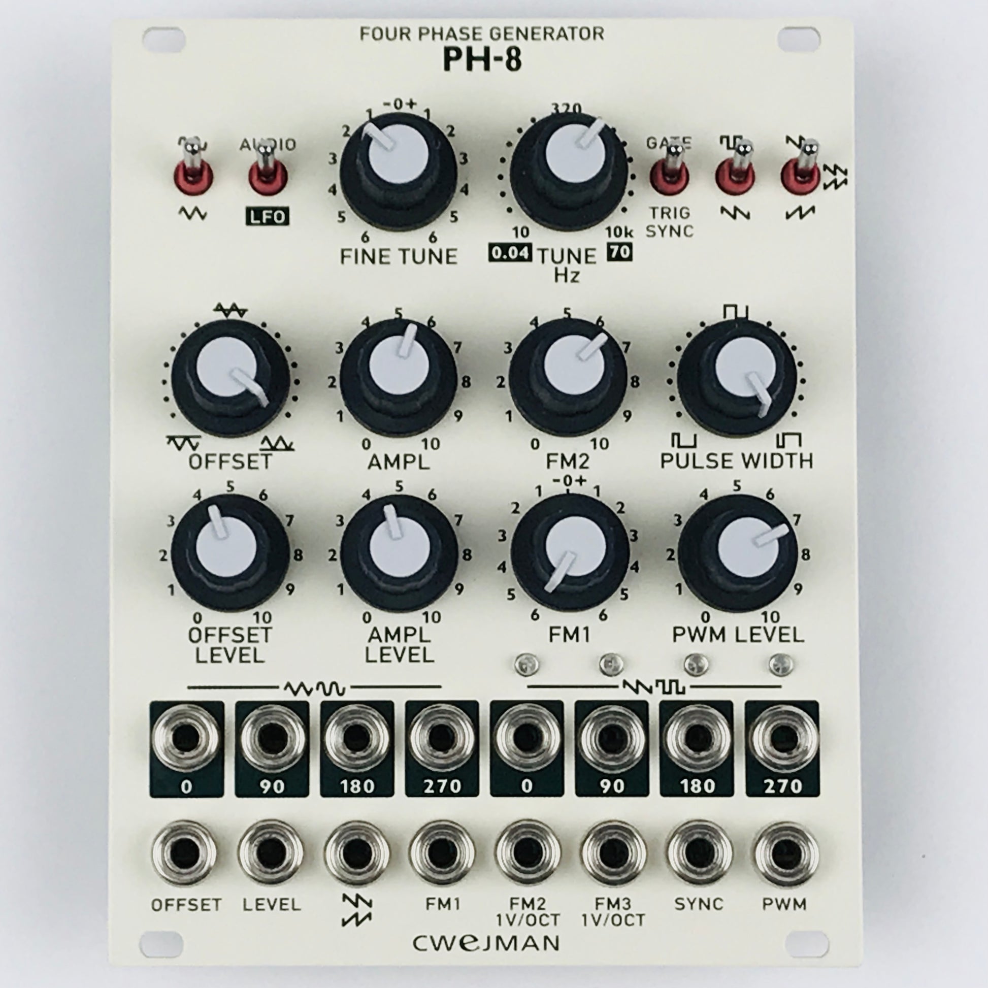 The Cwejman PH-8 is a powerhouse of a Eurorack module, ideal as the centre-piece for any sound design-based modular system. The PH-8 is the bigger sibling of the PH-4, boasting a wider selection of waveforms and additional outputs. The PH-8’s versatile design means it can be used as a premium-grade, full-range oscillator, as well as working as an LFO. It can handle quadratures and features an in-depth modulation control section with a wide range of precision attenuators.