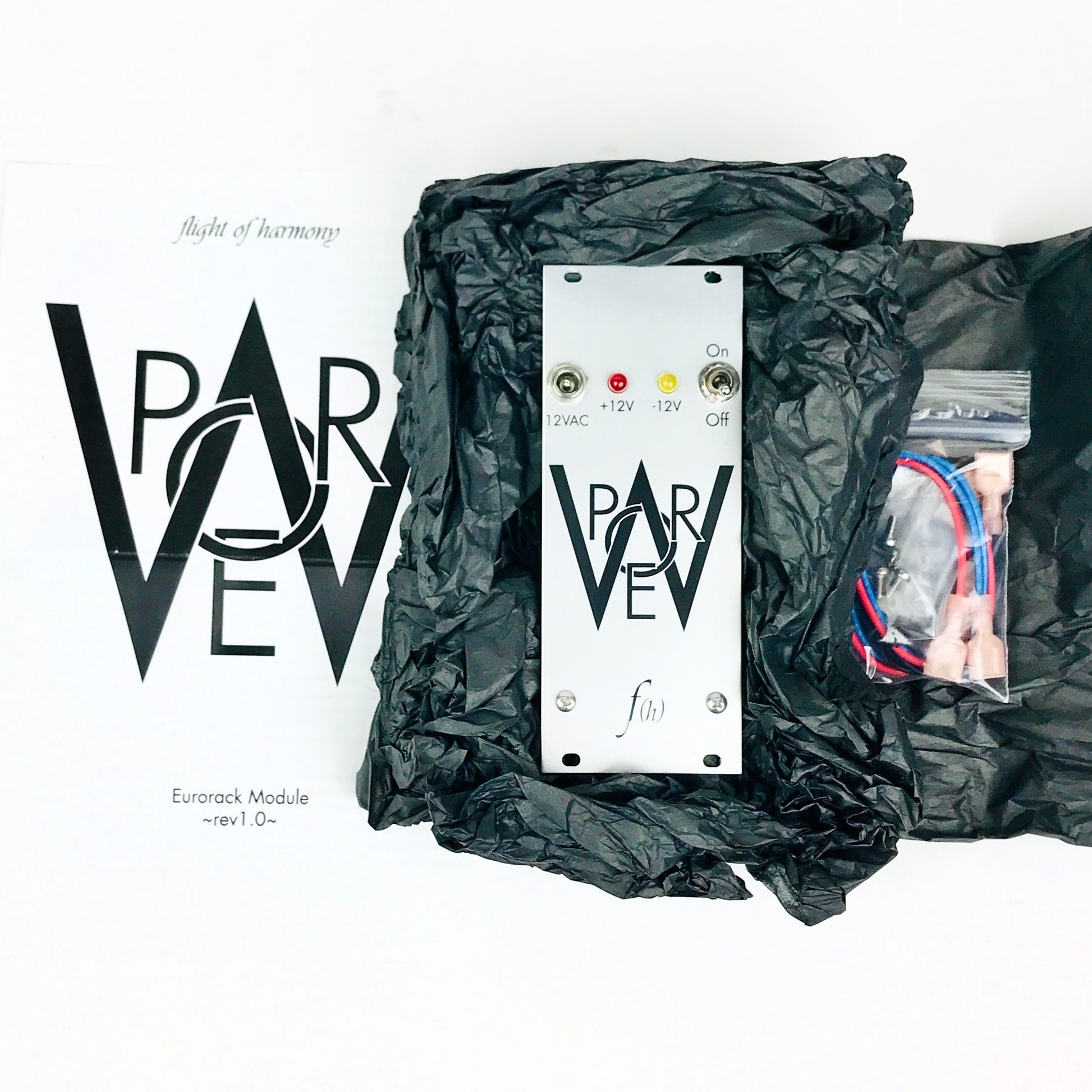 POWER is a 10hp power supply for eurorack systems, has outputs of ᄆ12VDC at 1A each, on/off switch, and indicator LEDs for each rail. The mounting depth is 40mm (1 9/16″). It uses a 12VAC wall adapter (included) to keep the transformer outside of the rack and avoid hum and magnetic coupling issues. Includes 13″ Doepfer-style 18AWG wire harness with quick-connect connectors.