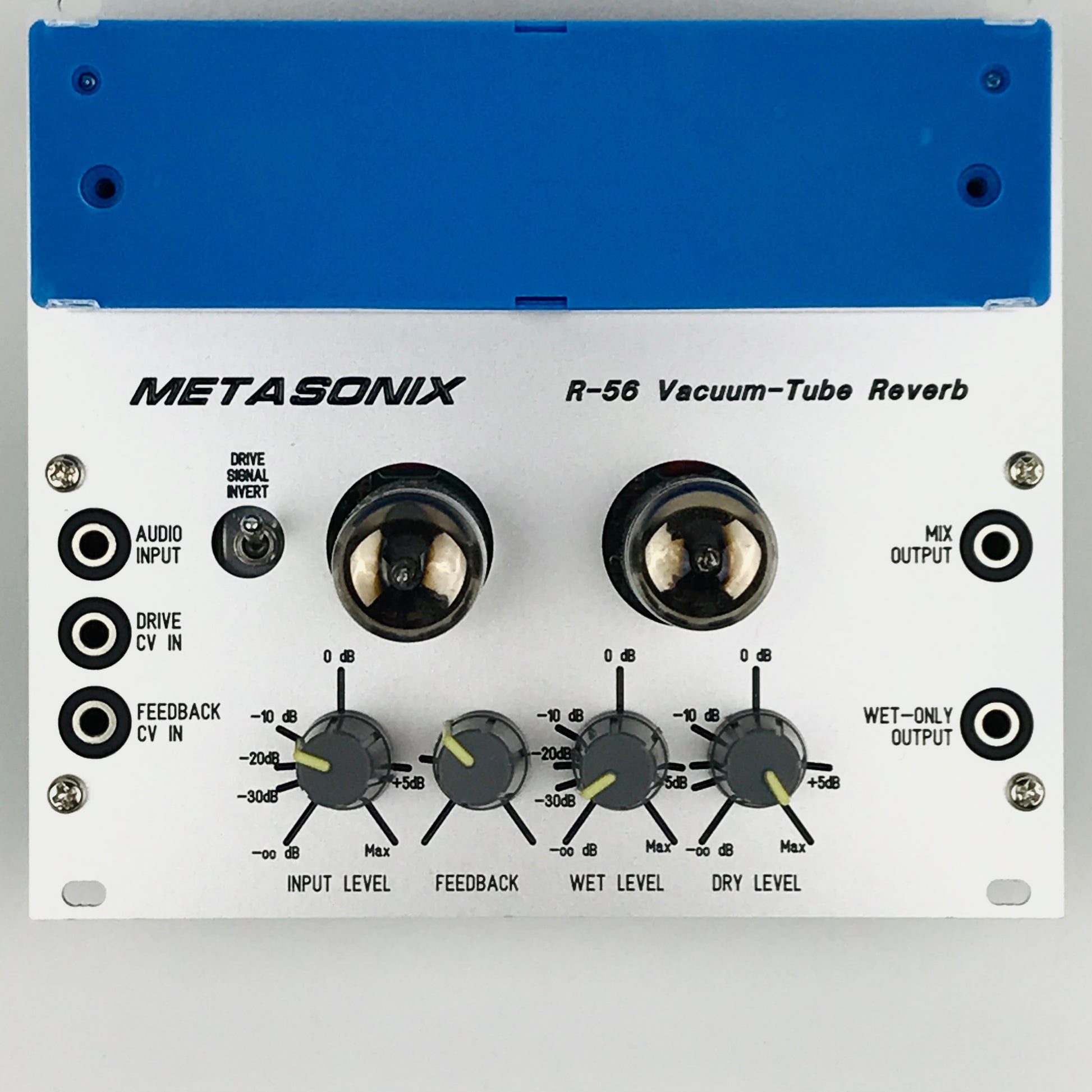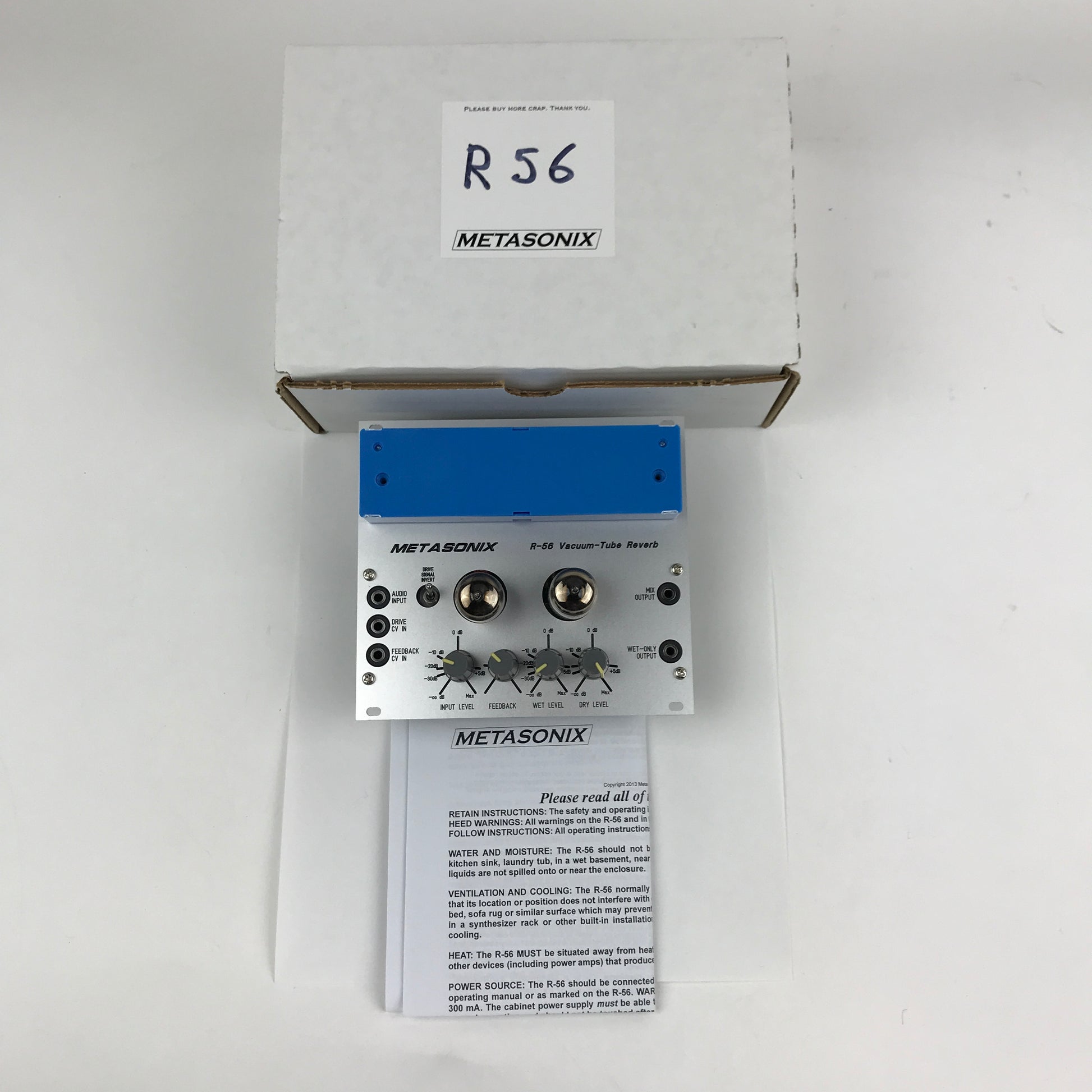 The Metasonix R-series of vacuum-tube modules is intended for use in any "Eurorack" standard modular synthesizer system. The R-56 module is 28HP (146mm) wide and fits in any Doepfer(tm), Analogue Systems(tm), or other compatible cabinet. The R-56 is powered entirely from the cabinet's internal +-12v dc power supplies, using Doepfer compatible 16-pin power connectors. (+5v power is not used.) The circuits protrude behind the panel less than 38mm (1.5 inch). All vacuum tubes are NOS (new old stock) types from classic American and European manufacturers that are run very conservatively for long life, and are readily available from distributors. The tubes protrude from the panel for visibility and cooling, less than 38mm (1.5 inches), and should fit inside a Doepfer A-100 suitcase cabinet lid or into a Doepfer mini case. All audio inputs and outputs and CV inputs/outputs are 100% compatible with other synthesizer modules. Plate voltage is provided by a tiny switching supply producing clean 48v regulated at low current, which is very safe and will not injure the user. Potentiometers are top-quality Alpha RK12L types, and 3.5mm phone jacks are special Kobiconn vertical-mount types, much better quality than the cheap ones usually seen in Euro modules. Each R-56 is fully protected against reverse supply voltage, overvoltage, undervoltage, or incorrect hookup to external equipment. As with all our products, the R-56 is totally handcrafted in Northern California, USA.