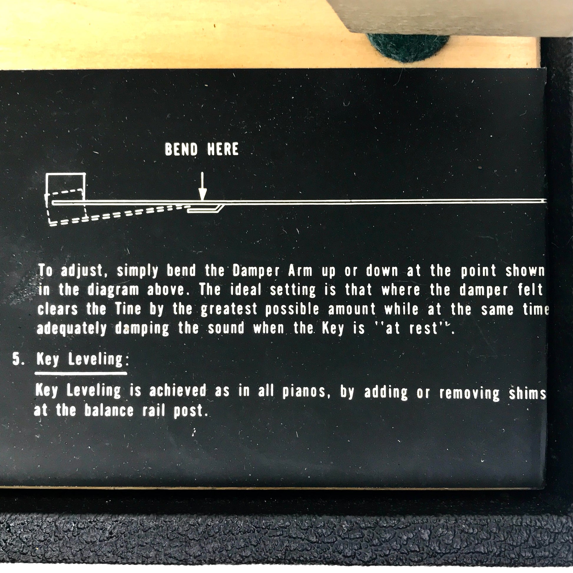 - Demonstration: By simply striking the single key, a salesperson could produce the definitive sound that made the Rhodes famous, giving a prospective customer an immediate impression of its sonic character.