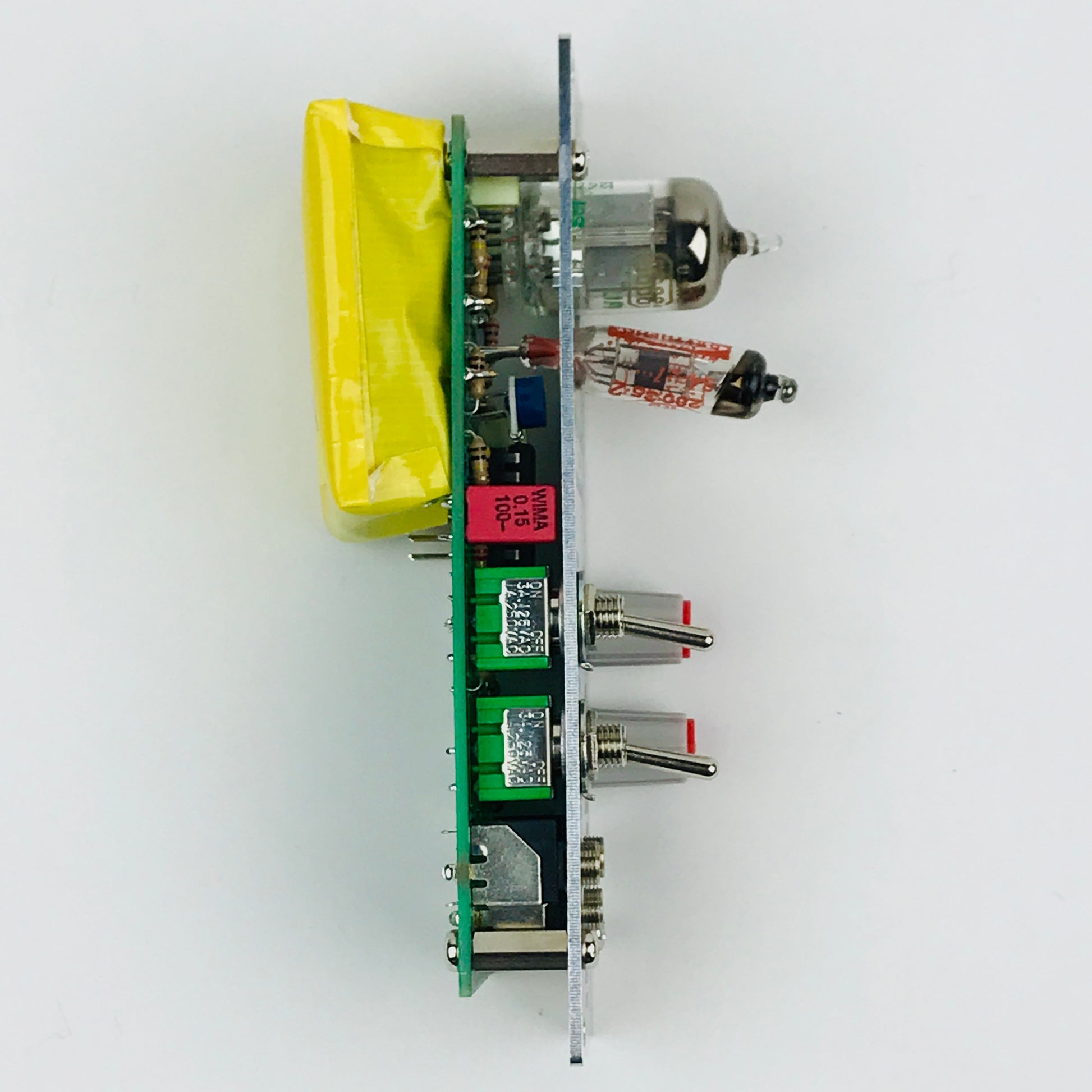 The RK-7 is an 8HP Eurorack version of the legendary TM-3/S-1000/R-55 VCO circuit. The entire circuit is based on two tubes: a 5696 thyratron and a 5702 subminiature pentode, both of which are military surplus tubes used in avionics. The 5696s are still available but getting scarce, and they require a higher plate voltage then our other Eurorack modules. Like the R-055, the RK7 has a pentode clipping stage which provides voltage control over the gain and clipping level. 5702 subminiature pentodes have always been rare and little used outside of military equipment.