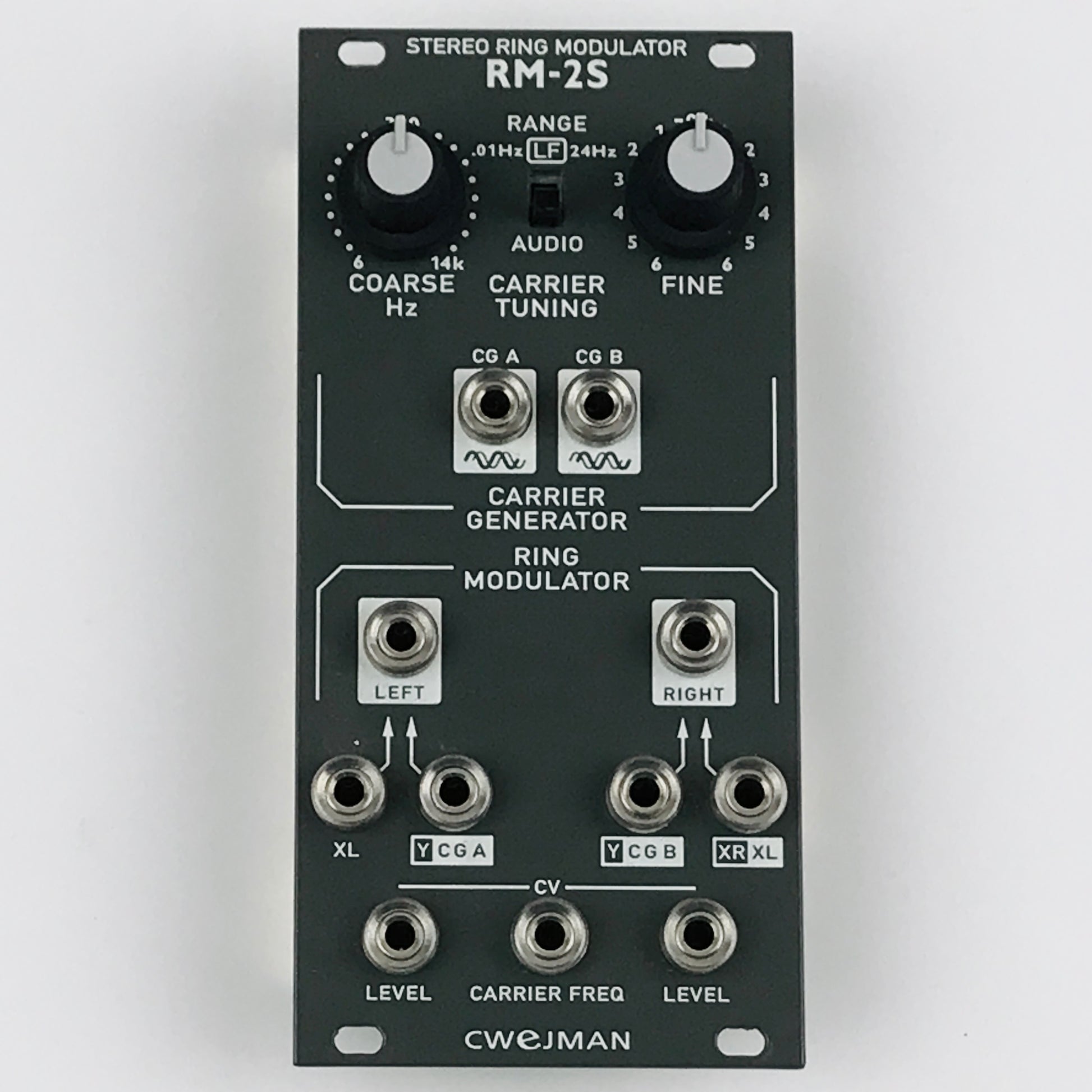The carrier generator has two frequency ranges; LF (low frequency) and AUDIO and it's controlled by knobs COARSE, FINE and external CV signal (CARRIER FREQ). The carrier generators outputs CG A and CG B are pure sine waveforms with 90 degrees delay between them. Outputs are pre-patched to both ring modulators (inputs Y). The obvious effect (particularly in LF mode) is a stereo panning effect of inserted signal to XL input. Both ring modulators can also be used independent of each other and carrier generator.
