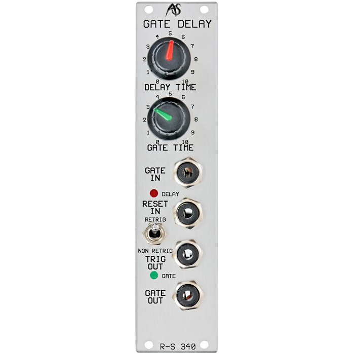 The rs340 is a multi-mode Gate Delay module and Shaper that recognizes any positive-going pulse exceeding +1V, and then generates a Trigger and a Gate of specified duration a user-defined time afterwards. Two LEDs offer visual feedback regarding the Gate status of the module. GATE IN