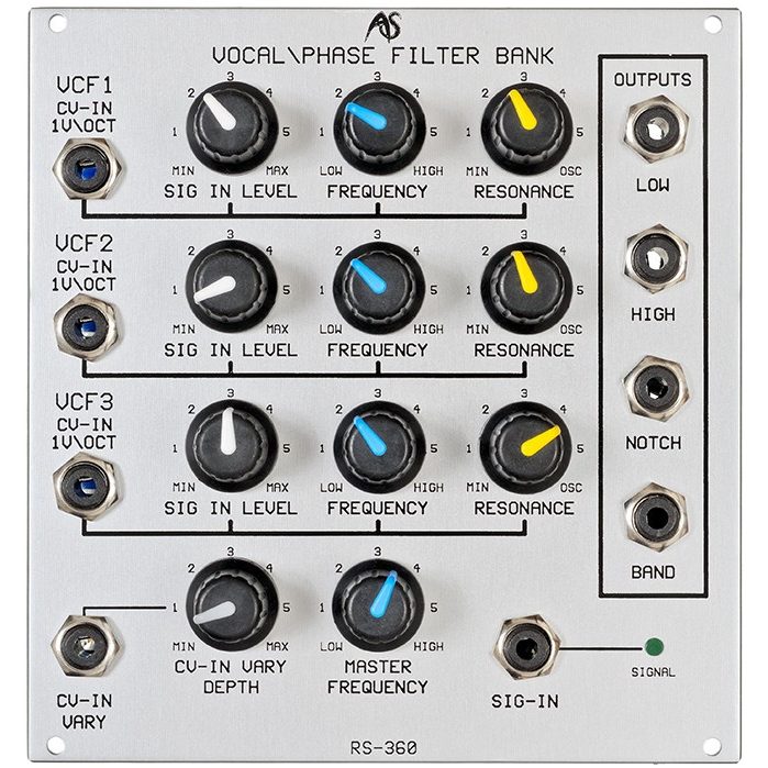 Normally, formant synthesis requires at least three formant filters per sound with appropriate CVs for each. The RS360 provides all of this in a single 24 HP module. However, the RS360 is more than just a formant filter. All three filters produce the four common filter characteristics: low-pass, high-pass, notch and band-pass, with summed outputs that offer the low-pass outputs of all three filters, the high-pass outputs of all three, and so on.