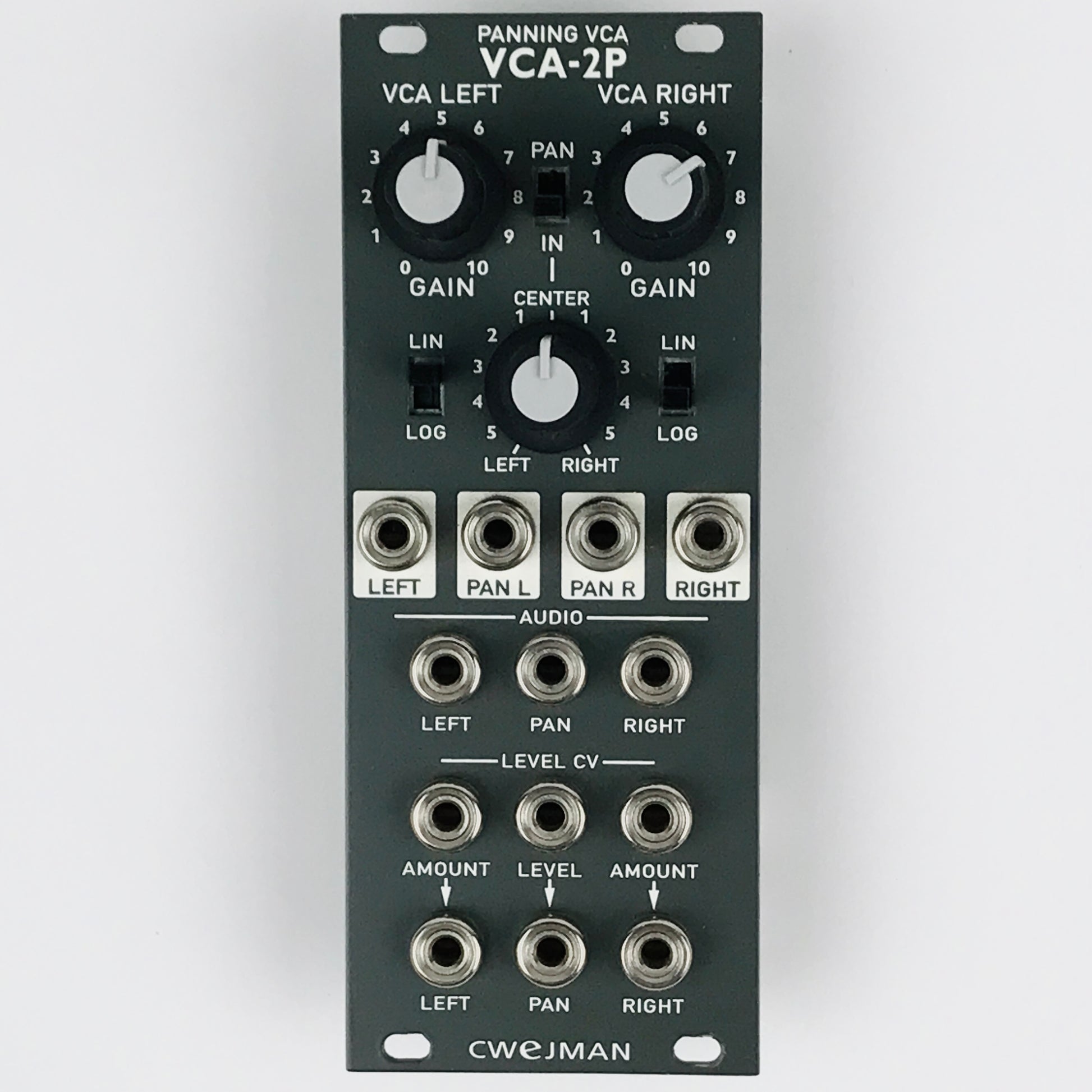 The VCA-2P is a stereo (dual channel) voltage controlled amplifier. VCA LEFT and VCA RIGHT can work in a linear and logarithmic mode. The panning VCA can be coupled as panning VCA between VCA LEFT and VCA RIGHT (PAN switch in position "IN" and controlled manually by knob and/or by signal inserted to LEVEL CV, PAN input) or as an stand-alone dual voltage controlled amplifier (PAN L, PAN R). The panning VCA's are different from main VCA's in the sense that amplitude modulation acts with both positive and negative control signal and around zero. The depth of amplitude modulation is dependent of amount of controlling signal.