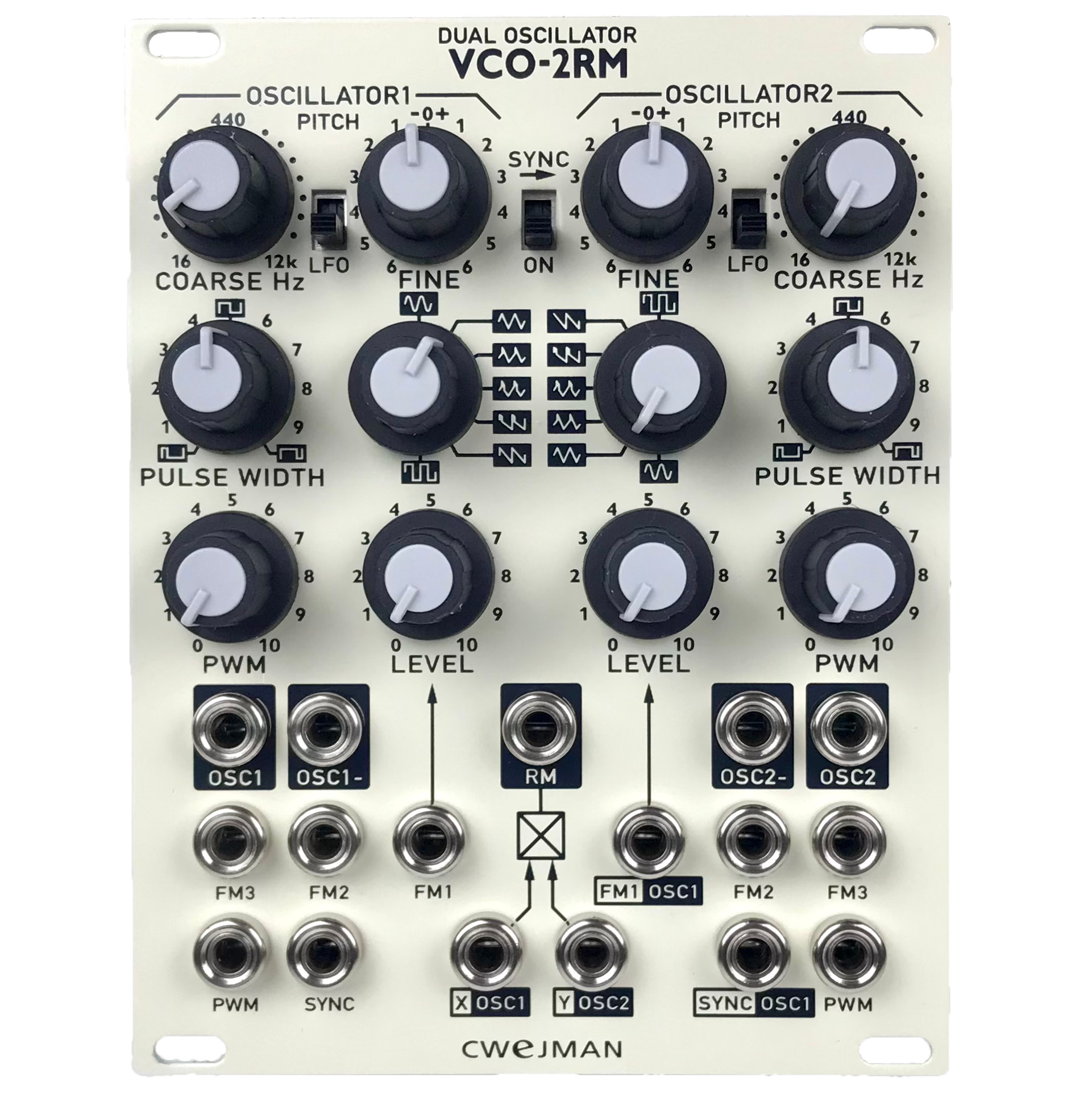Oscillators are the main sound sources of a synthesizer. The Cwejman VC0-2RM oscillator is equipped with seven waveforms, LFO mode, sync and waveform outputs are routed to a DC coupled ring modulator (RM). The oscillator's frequency is controlled by COARSE, TUNE knobs and FM inputs. TUNE fine tunes the oscillators (ᄆ 6 semitones).
