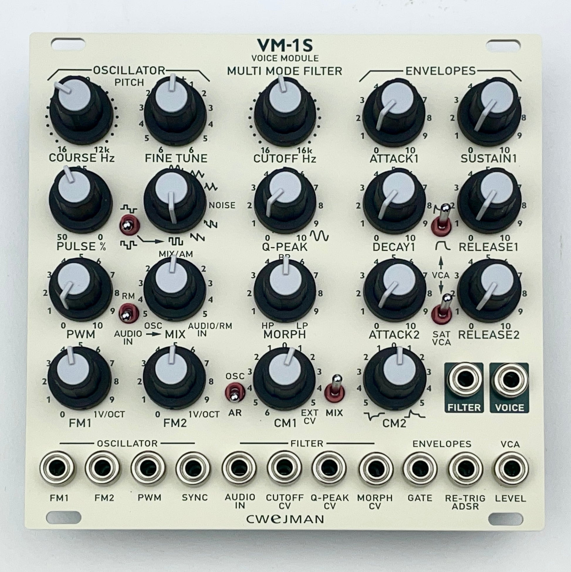 The Cwejman VM-1s is a full-blown synthesizer voice in proven Cwejman quality. More precisely, the module features an oscillator, a multimode filter, ADSR and AR envelopes as well as a VCA. Compared to its predecessor, the Mk2 offers more (complex) VCO waveforms and noise. Furthermore, a ring modulator and switchable VCA saturation were implemented. The VM-1 Mk2 can produce crystal-clear to wonderfully creaky sounds. Thanks to all kinds of audio and CV connectors, the module can be easily expanded by third-party circuits.
